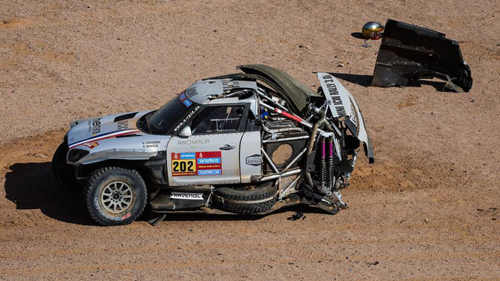 Guerlain Chicherit perdió el control de su Mini tras encontrar un desnivel a alta velocidad y salió despedido por los aires.