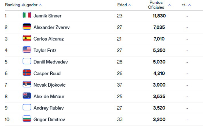 En el top 10 se mantuvo el mismo orden. El líder del ranking sigue el italiano Jannik Sinner. Lo siguen Alexander Zverev y Carlos Alcaraz.