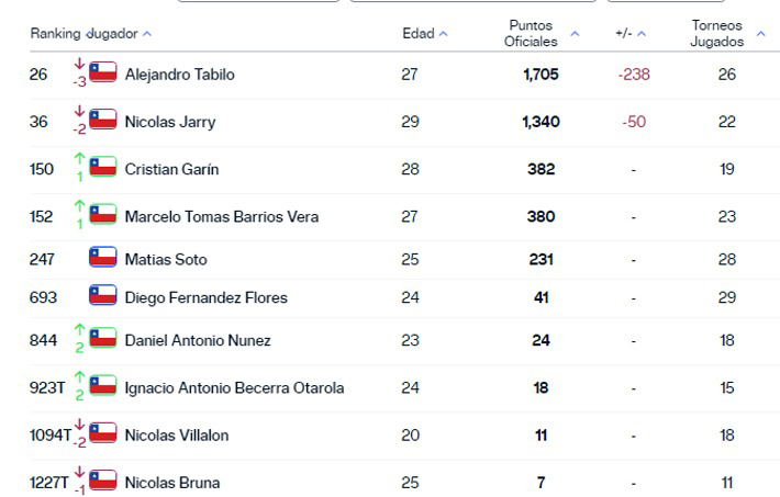 Nicolás Jarry también sufrió un descenso. Pasó del puesto 34 de la clasificación al 36.