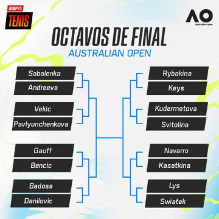En la sección femenina, la 2 del mundo Iga Swiatek mantuvo su paso aplastante al derrotar a Emma Raducanu (61°) por 6-1 y 6-0. En la cuarta ronda se cruzará con la sorprendente alemana Eva Lys (128°), que hizo historia al convertirse en la primera lucky loser en avanzar hasta octavos de final en Australia desde 1988.