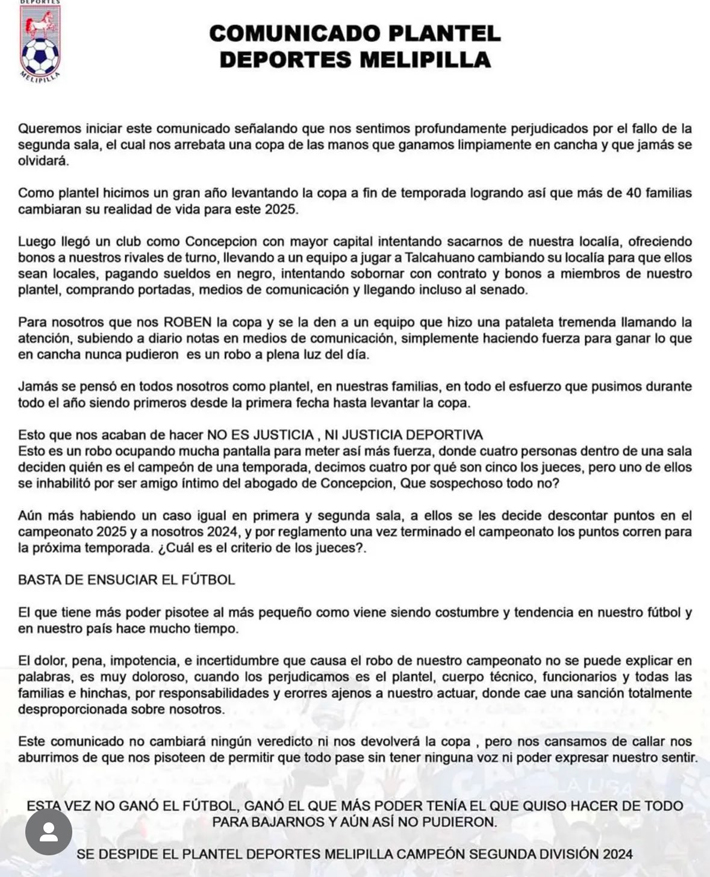 "Aún más habiendo un caso igual en Primera y Segunda Sala, a ellos se les decide descontar puntos en el Campeonato 2025 y a nosotros 2024, y por reglamento una vez terminado el Campeonato los puntos corren para la próxima temporada. ¿Cuál es el criterio de los jueves? Basta de ensuciar el fútbol. El que tiene más poder pisotee al más pequeño como viene siendo costumbre y tendencia en nuestro fútbol y en nuestro país hace mucho tiempo", continuaron.