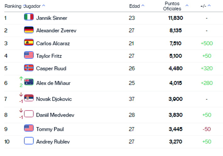 Finalmente, en el top 10 hubo movimientos. Jannik Sinner sigue siendo el 1° y Alexander Zverev el 2°, pero Carlos Alcaraz (3°) se acercó bastante al alemán tras consagrarse en el ATP 500 de Rotterdam.