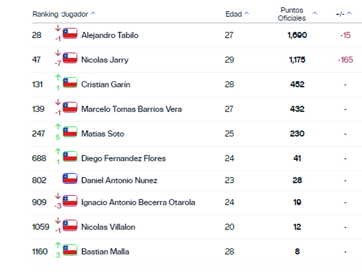 Alejandro Tabilo también cayó, del 27 al 28°.