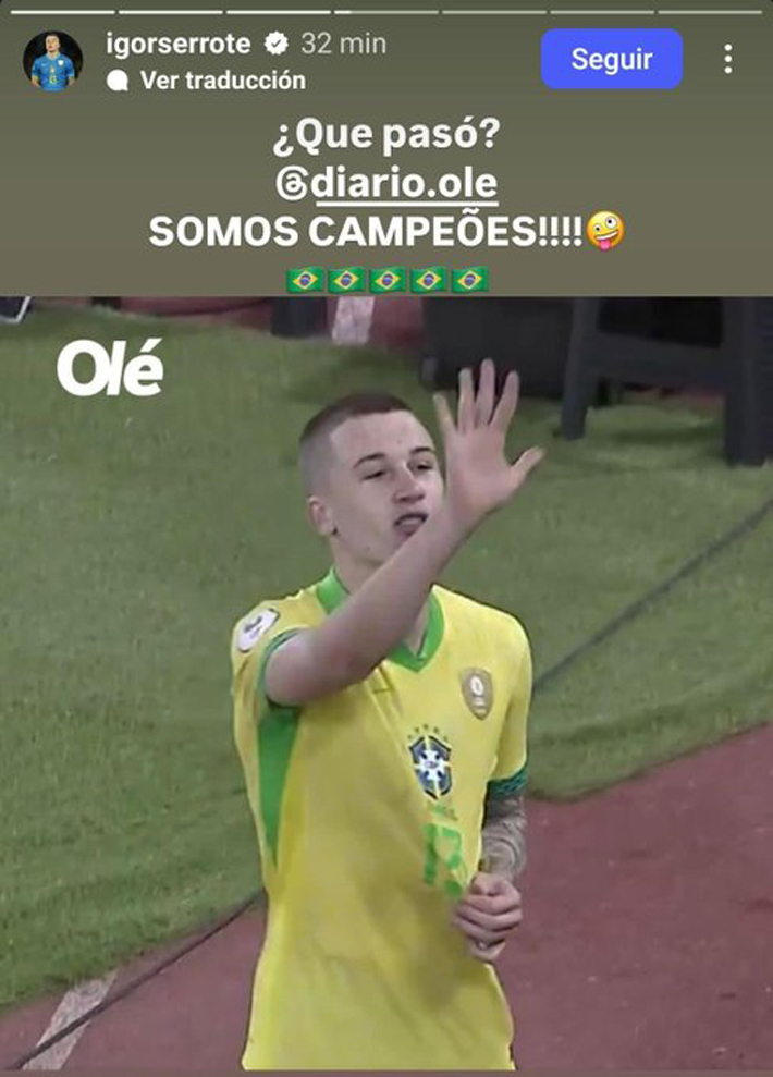 Igor Serrote, defensor de esta Brasil Sub 20, hizo una transmisión en vivo a través de su cuenta de Instagram durante la ceremonia de premiación. Enfocó a los argentinos abatidos e inmediatamente después a él y a sus compañeros celebrando.