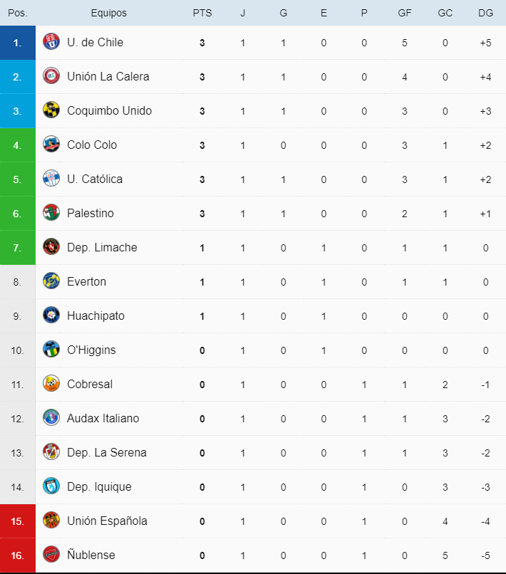 Universidad de Chile, La Calera, Coquimbo, Colo Colo, Universidad Católica y Palestino ganaron sus partidos. Pero son los azules los que están en la cima debido a la diferencia de gol. Le hicieron 5 a Ñublense.