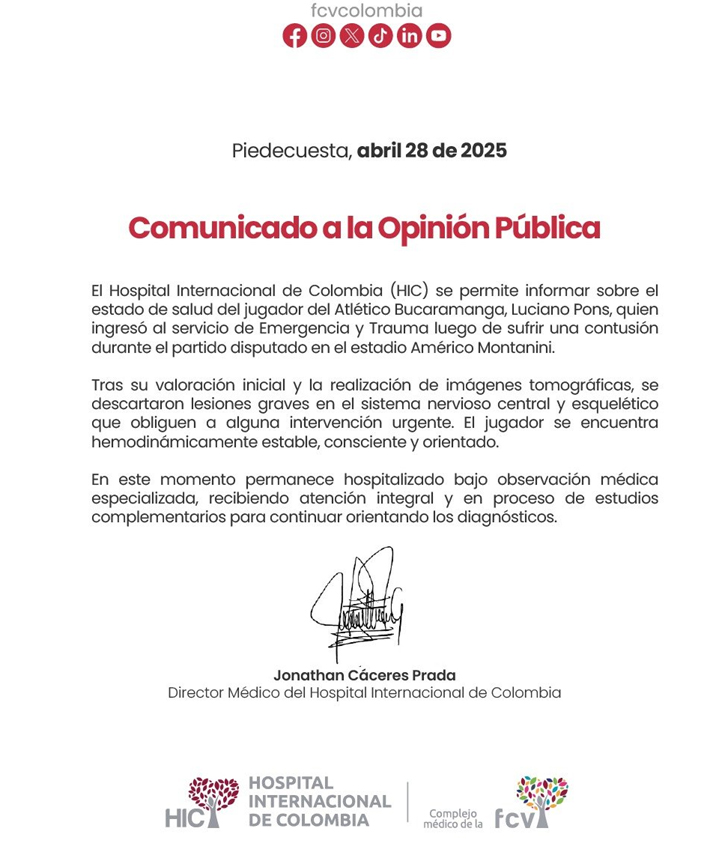 "(...) Se descartaron lesiones graves en el sistema nervioso central y esquelético que obliguen a alguna intervención urgente. El jugador se encuentra hemodinámicamente estable, consciente y orientado", dice el texto del Hospital Internacional de Colombia.