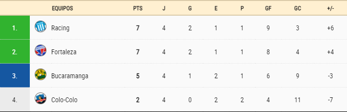 se mantienen como colistas de la zona con apenas 2 puntos. Lidera Racing con 7, le sigue el cuadro brasileño con 7 (peor diferencia de gol) y tercero es el Bucaramanga con 5.