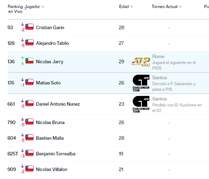 Detrás de él aparecen Cristian Garin (93°), Alejandro Tabilo (128°), Jarry (136°) y Matías Soto (176°).