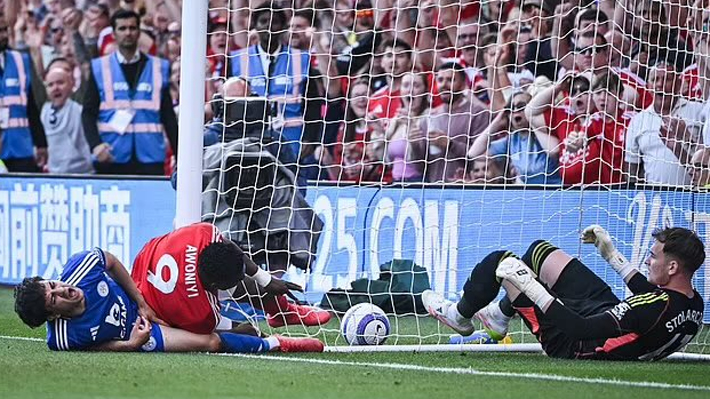 El ataque del Forest tenía que haber sido inválido por fuera de juego, pero no podían parar la jugada hasta que esta acabara, en caso de que pudiera entrar el VAR, y Awoniyi, tratando de marcar, chocó fuertemente contra el palo.