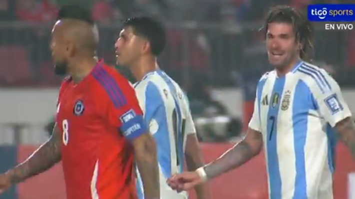Cuando terminó el primer tiempo, la disputa continuó, aunque eso pasó desapercibido en la transmisión oficial para Chile. De Paul, con espíritu conciliador, se acercó a Vidal para darle un abrazo, pero el jugador chileno lo corrió con un empujón.