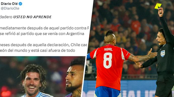 El citado medio de comunicación recordó una frase que el ex Juventus dijo hace poco. "Contra Argentina va a ser más fácil. Frente a Argentina siempre jugamos bien y más con nuestra gente", afirmó Vidal en marzo de este año.