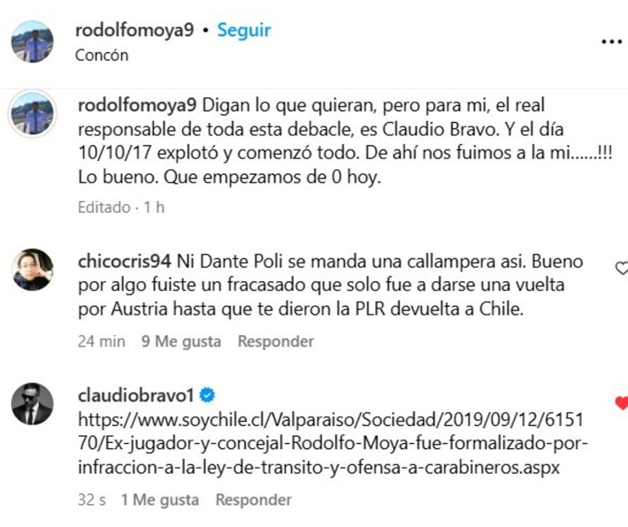 "Digan lo que quieran, pero para mí, el real responsable de toda esta debacle, es Claudio Bravo. Y el día 10/10/17 explotó y comenzó todo. De ahí nos fuimos a la mier...", expresó Moya en Instagram.