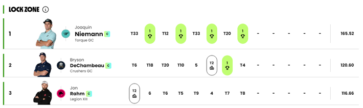Niemann está en la cima con 165.52 puntos, seguido de Bryson DeChambeau con 120.60 y Jon Rahm que tiene 116.66.