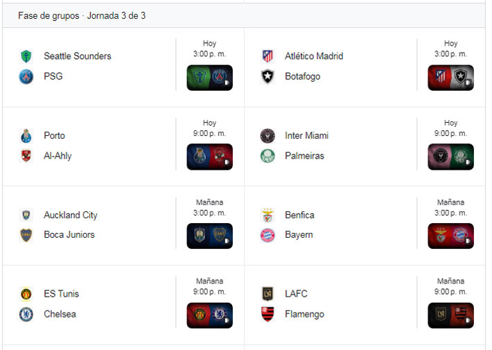 Palmeiras e Inter Miami mandan con 4 puntos. Les siguen el Porto y el Al Ahly con 1 unidad. Los dos líderes juegan entre ellos y les basta un empate para que ambos clasifiquen a octavos.