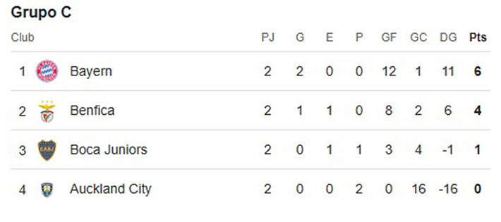 Hoy se cierra el Grupo desde las 15 horas. Boca actualmente es tercero con 1 punto. Líder es el Bayern Munich con 6 y segundo Benfica con 4. Último es el Auckland sin unidades.