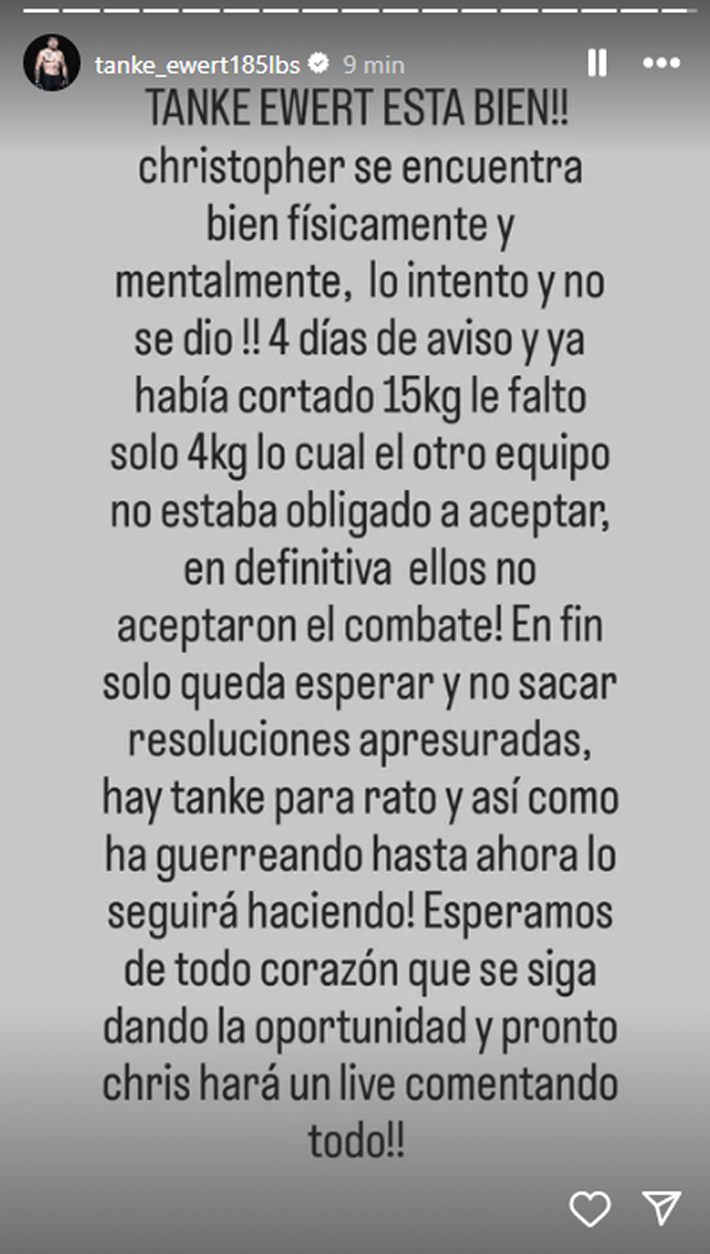 "Christopher se encuentra bien física y mentalemente, lo intentó y no se dio. Cuatro días de aviso y ya había cortado 15kg, le faltaron solo 4kg, lo cual el otro equipo no estaba obligado a aceptar. En definitiva ellos no aceptaron el combate. En fin solo queda esperar y no sacar resoluciones apresuradas, hay 'Tanke' para rato y así como ha 'guerreado' hasta ahora lo seguirá haciendo".