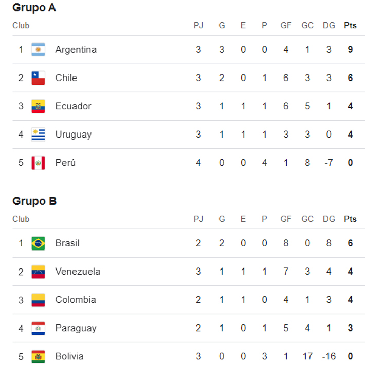 En tanto, en el Grupo B el líder es Brasil con 6 unidades, seguido de Venezuela y Colombia con 4. Paraguay tiene 3 y Bolivia cierra con 0. Este grupo hoy juega la tercera fecha.