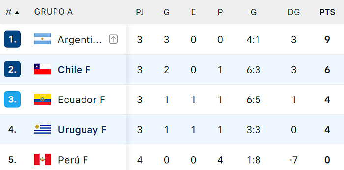 Tras vencer al local Ecuador, Chile está segundo con seis puntos, a tres de Argentina que ya timbró el primer lugar del Grupo, con 9 unidades.