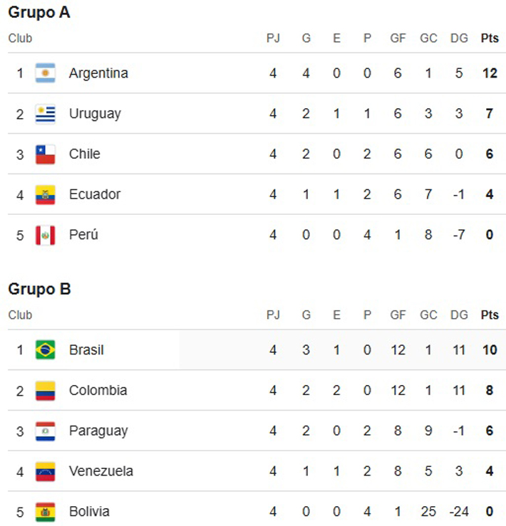 En cuanto a las semifinales, también quedaron definidas. Argentina (1° Grupo A) irá contra Colombia (2° Grupo B), mientras que Brasil (1° Grupo B) enfrentará a Uruguay (2° Grupo A).