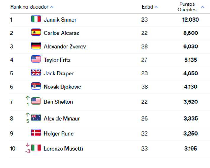 En tanto, en el top 10, el podio se mantiene igual: Jannik Sinner, Carlos Alcaraz y Alexander Zverev.