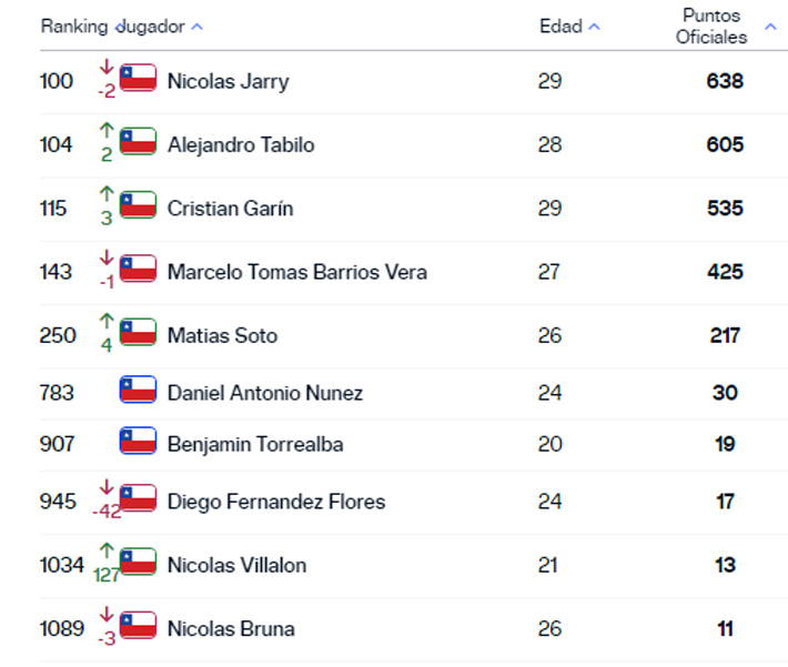 N°1 sigue siendo Nicolás Jarry, que bajó del 98 al 100. Es el único criollo dentro de los 100 mejores.