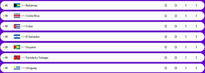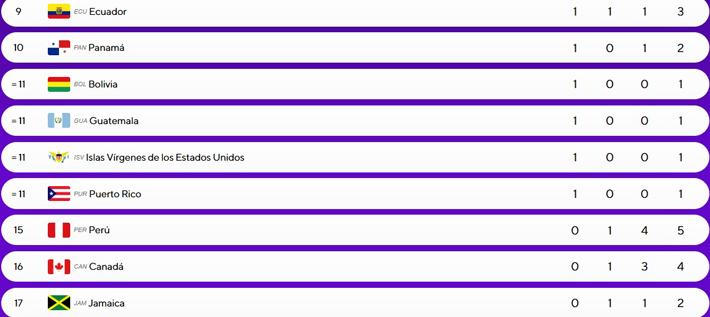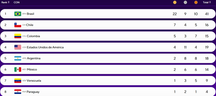 El líder es Brasil y le saca una diferencia muy grande a los demás por el momento. Acumula 41 preseas, 22 de ellas doradas.