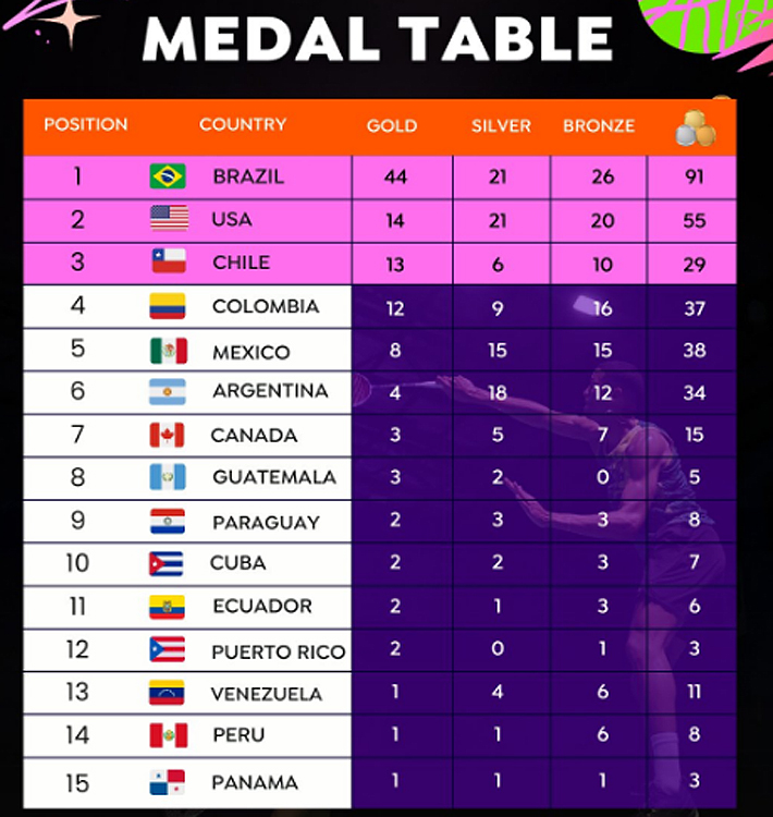 En cuanto al medallero, Chile sigue tercero, aunque se le acerca Colombia.