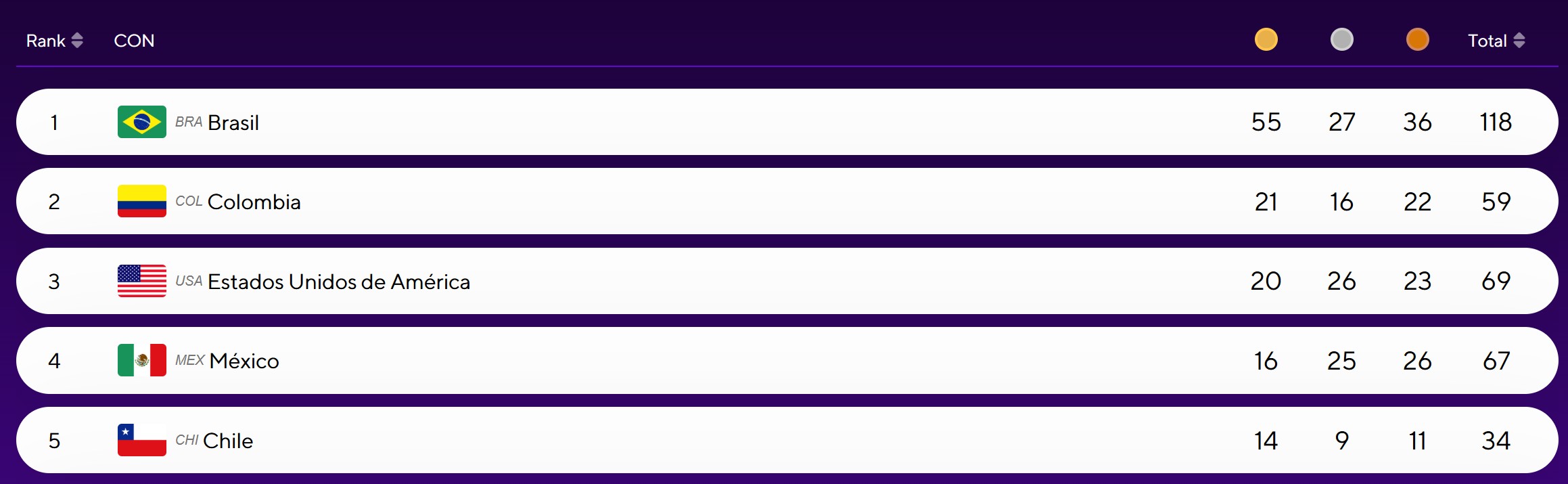 En el medallero, Chile está quinto con un total de 34 (14 oros, nueve platas y 11 bronces). El líder es Brasil con 55 primeros lugares, seguido por Colombia, Estados Unidos y México.