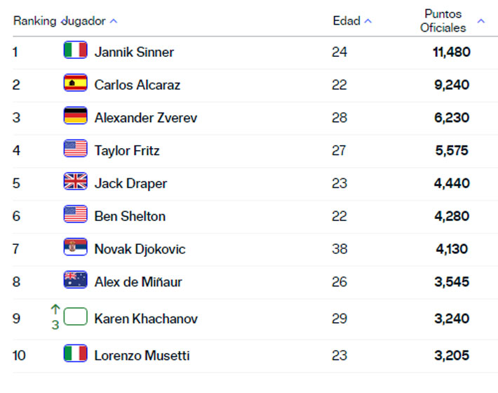 El número uno del mundo sigue siendo el italiano Jannik Sinner, mientras le siguen el español Carlos Alcaraz y el alemán Alexander Zverev.