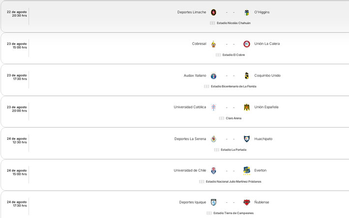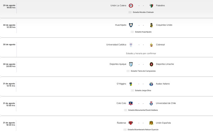 La semana siguiente, justo antes del parón, el partido principal es el Superclásico entre Colo Colo y la U, a jugarse el domingo 31 de agosto desde las 15:00 horas en el Estadio Monumental.