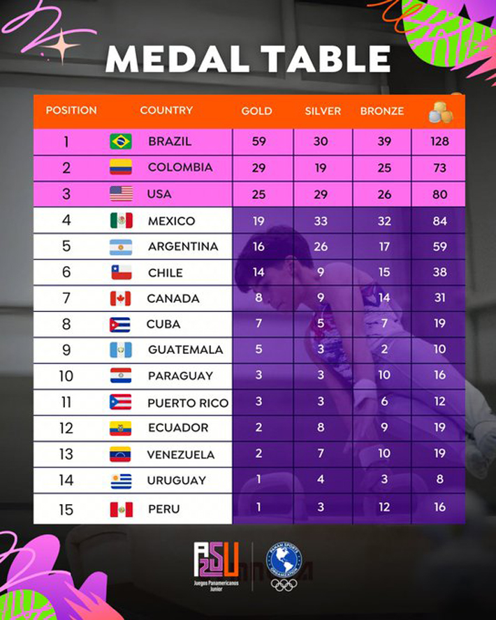 Chile en estos momentos tiene 38 preseas: 14 de oro, nueve de plata y 15 de bronce. Está en el sexto puesto del medallero.