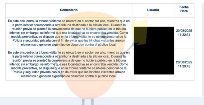"Como medida preventiva, se dispuso que en la tribuna visitante se ubique personal de la Policía y seguridad privada con el fin de evitar que los hinchas visitantes arrojen elementos o generen algún tipo de desorden contra el público local", se advirtió.