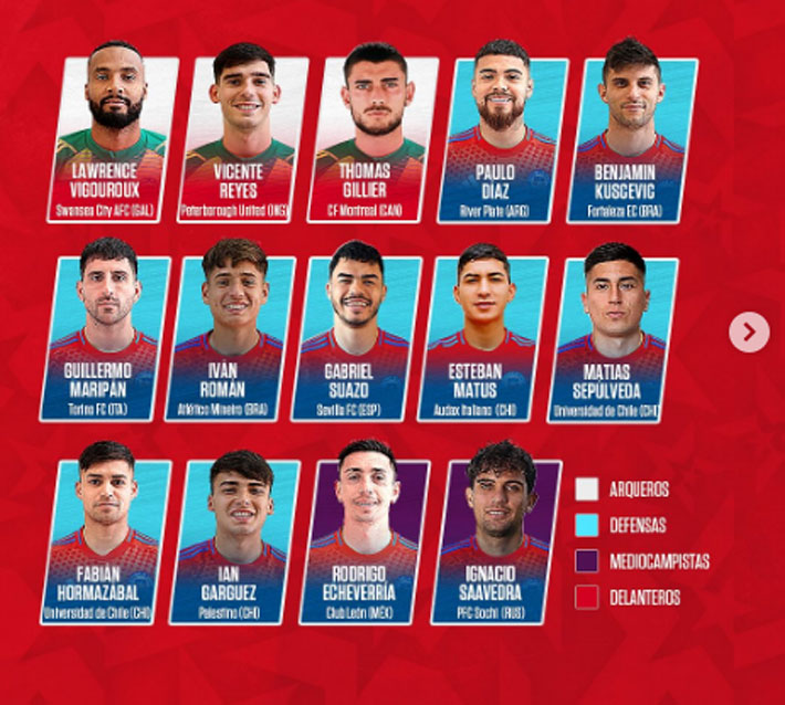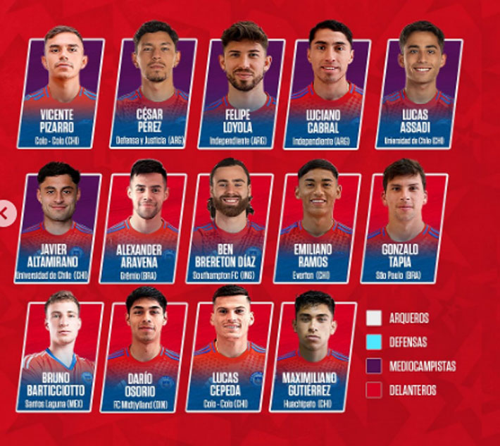Hay varias sorpresas. Una es el retorno de Ben Brereton. También resaltan Thomas Gillier, Ignacio Saavedra, César Pérez, Lucas Assadi, Alexander Aravena, Gonzalo Tapia y Bruno Barticciotto.