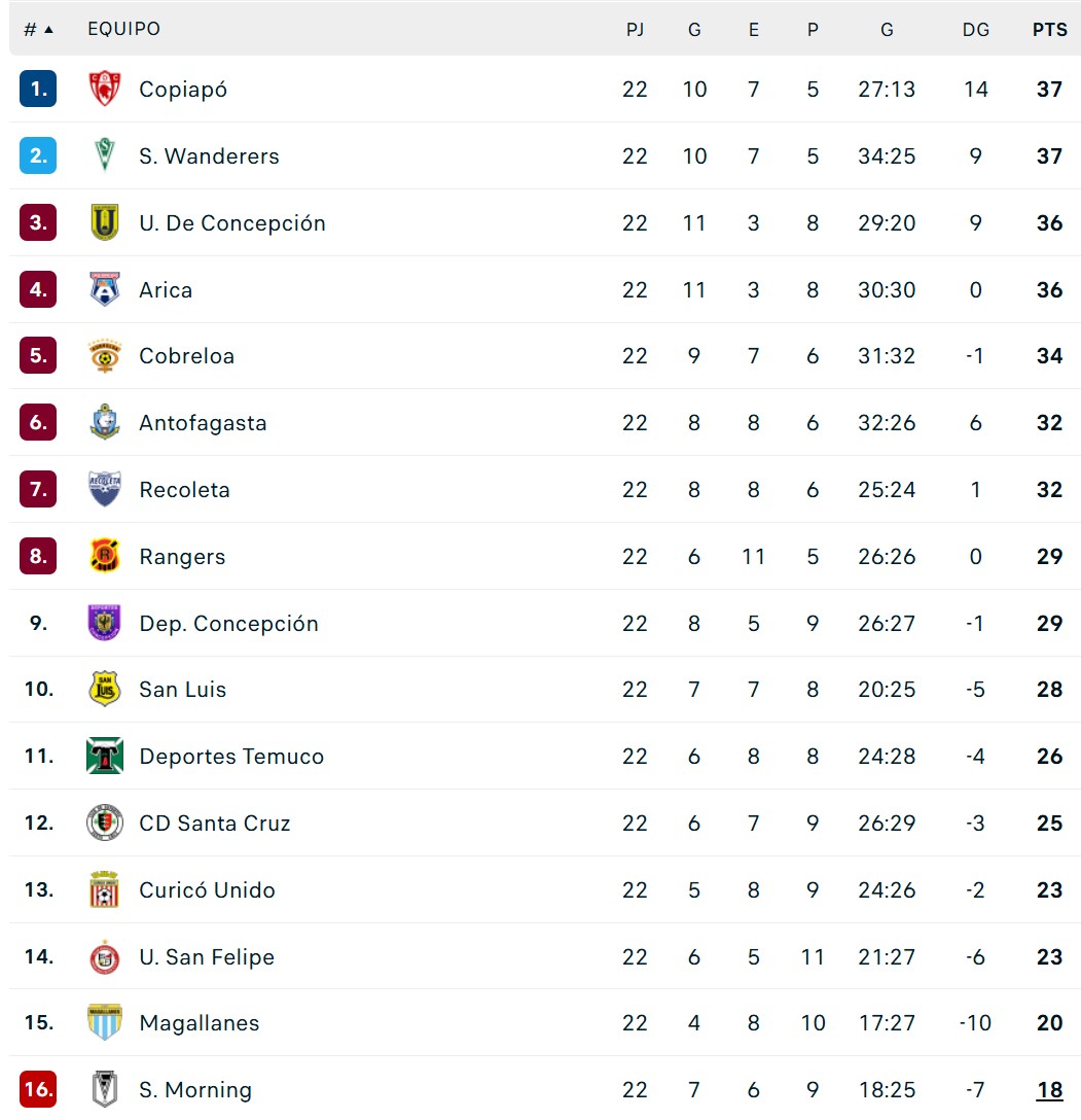Los punteros son Copiapó y Wanderers con 37 unidades, seguidos por Universidad de Concepción y San Marcos de Arica con 36, a uno de la cima.
