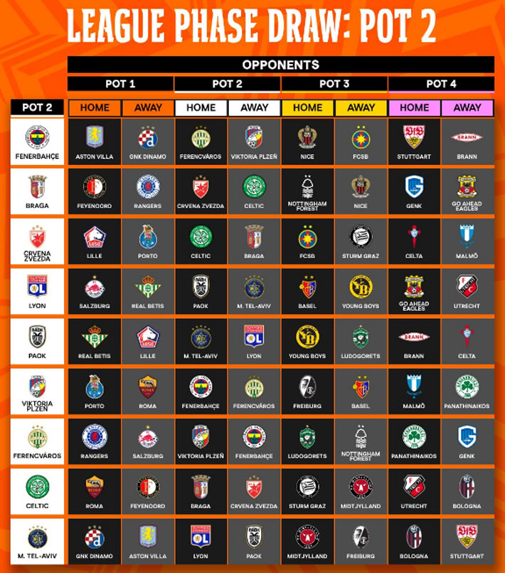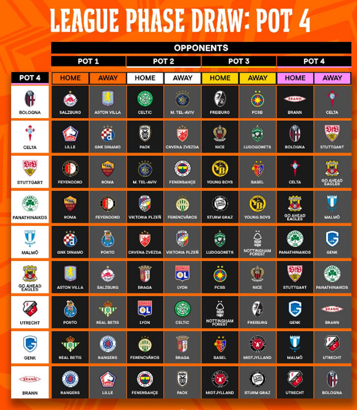 Finalmente el Brann se medirá contra Rangers (casa), Lille (visita), Fenerbahce (casa), Paok (visita), Midtjylland (casa), Strum Graz (visita), Utrech (casa) y Bologna (casa).