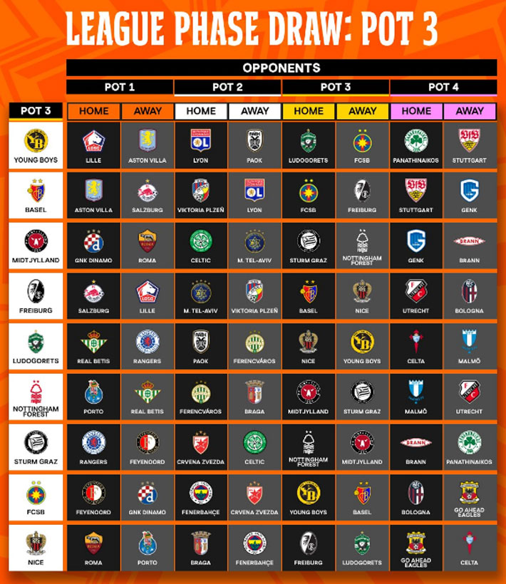 Midtjylland irá ante Dinamo Zagreb (casa), Roma (visita), Celtic (casa), Maccabi Tel Aviv (visita), Strum Graz (casa), Nottingham Forest (visita), Genk (casa) y Brann (visita).