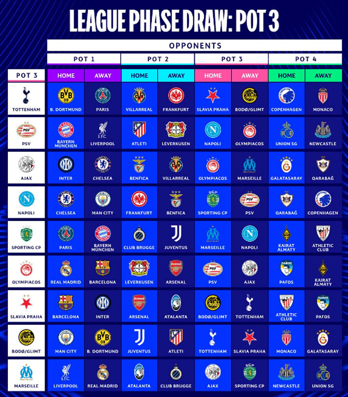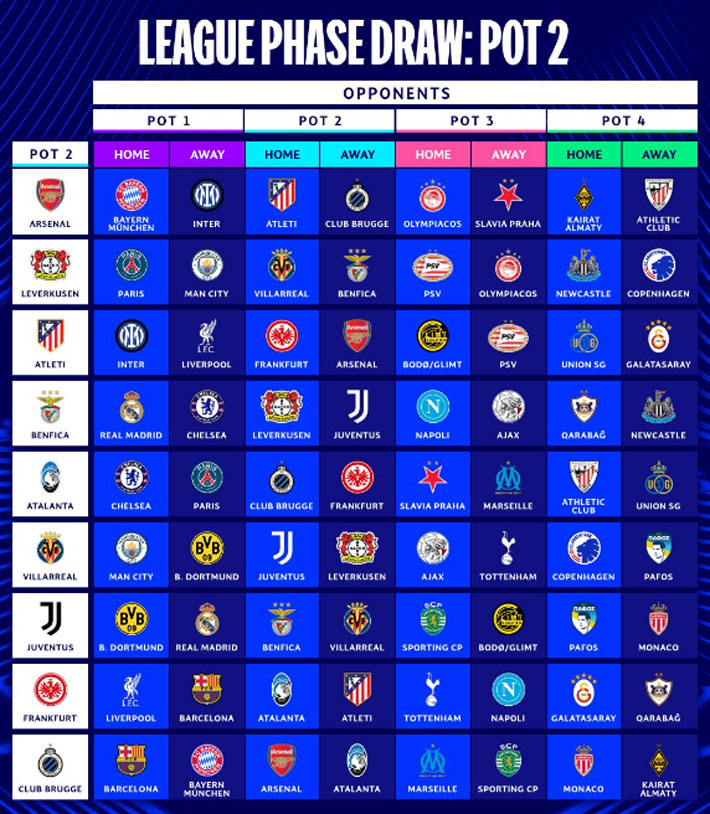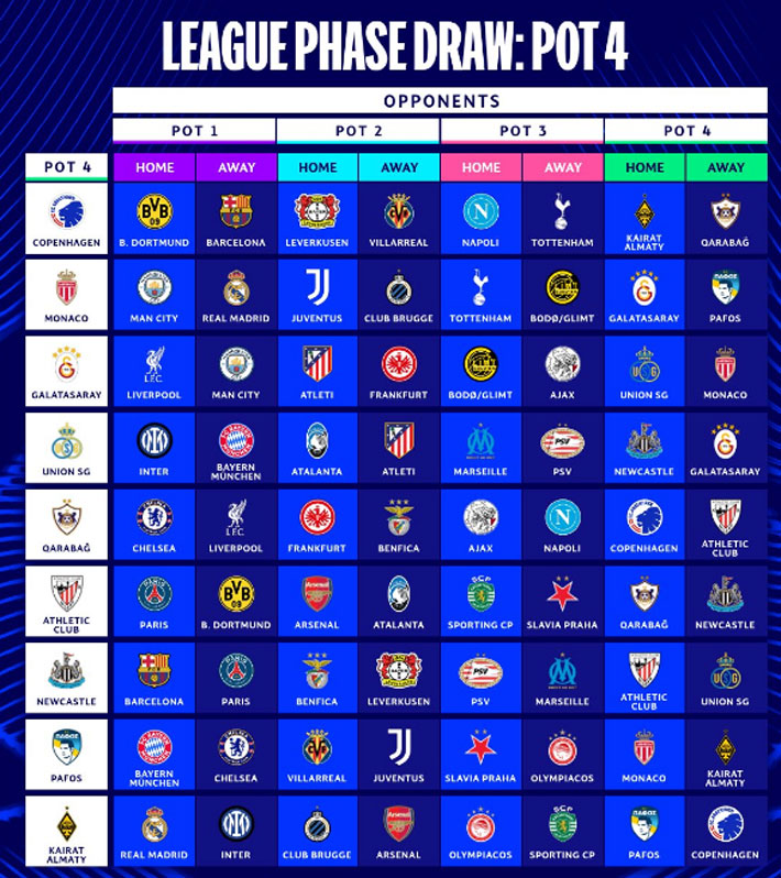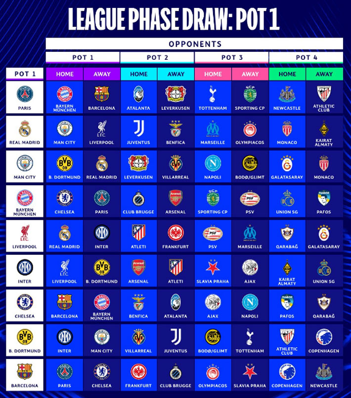 Recordar que la Champions ya no es por grupos. Tampoco existen los duelos de ida y vuelta con cada rival. Es una tabla única y cada equipo juega ocho partidos, 4 en casa y 4 de visita. Todos los cruces son con distintos contrincantes.
