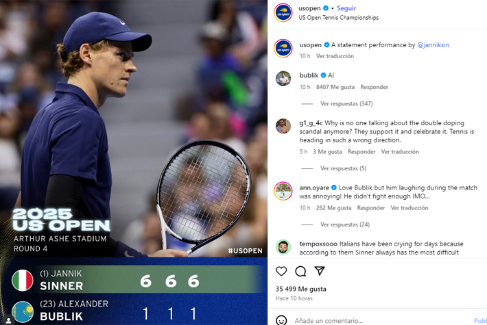Ante estas palabras, Sinner solo se reía. Pero Bublik luego de algunos minutos de su partido volvió a viralizarse, ya que en la publicación oficial del US Open que entregó el resultado del duelo, escribió: "IA".