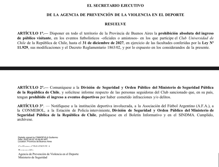 La Agencia expresó: "Disponer en todo el territorio de la Provincia de Buenos Aires la prohibición absoluta del ingreso de público visitante, en los eventos -oficiales o amistosos-en los que participe el Club Universidad de Chile de la República de Chile, hasta el 31 de diciembre de 2027".