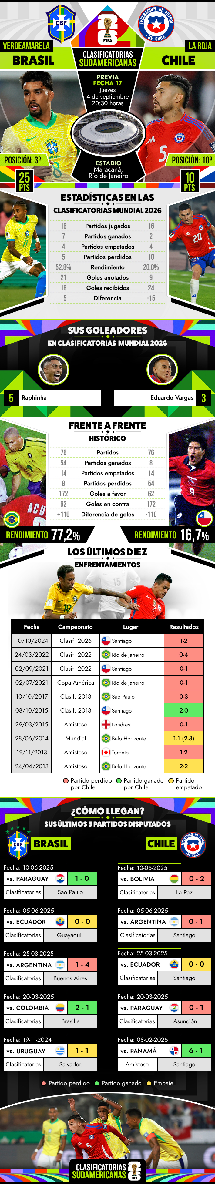 La última victoria de la "Roja" ante Brasil fue hace diez años: Los números con que llegan ambos equipos