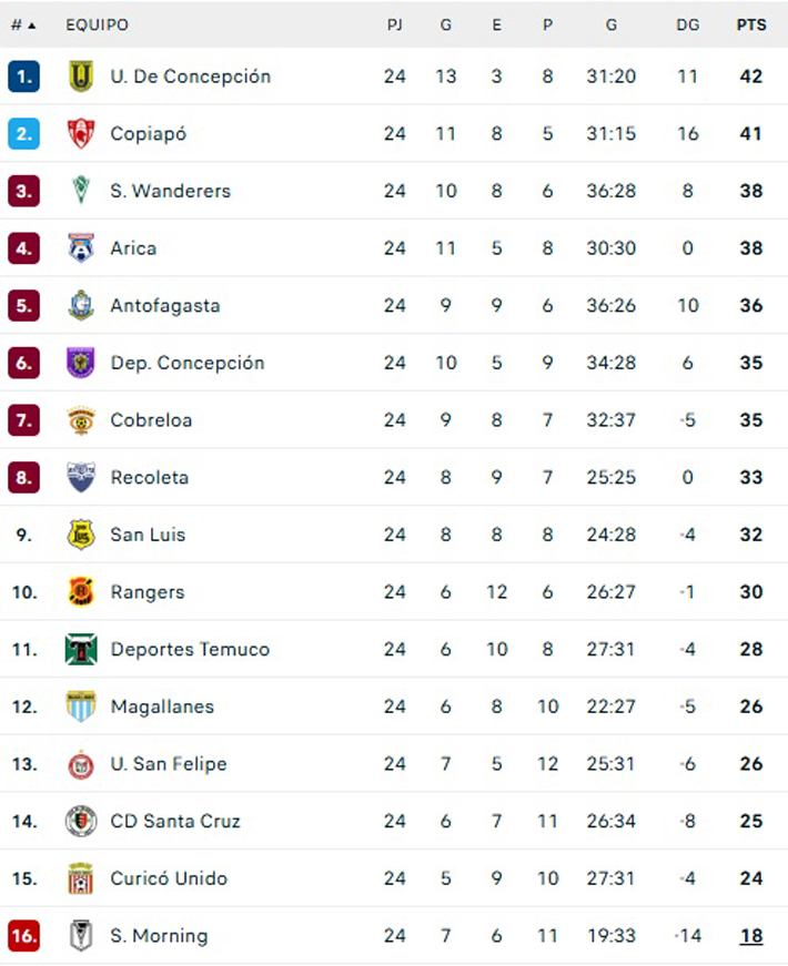 Hay que recordar que el colista es Santiago Morning. El "Bohemio", castigado por el no pago de cotizaciones previsionales, está en el fondo con 18 positivos y descendería en estos momentos.