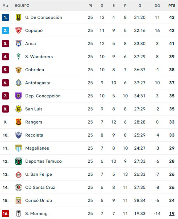 Hay que recordar que el colista del certamen es Santiago Morning. El "Chaguito", al que sancionaron por el no pago de cotizaciones previsionales, registra 19 unidades.
