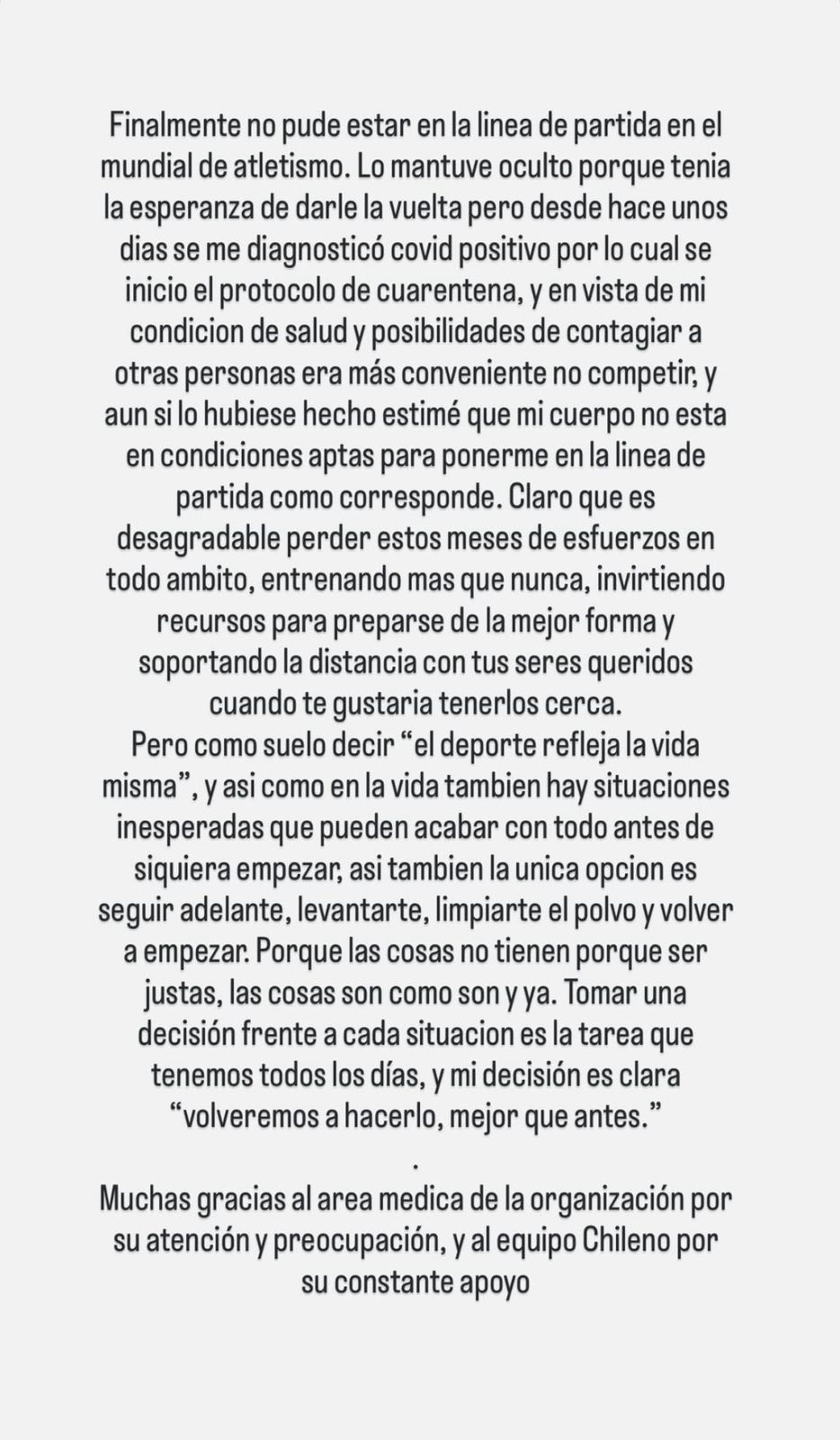 Finalmente no pude estar en la línea de partida en el Mundial de atletismo. Lo mantuve oculto porque tenía la esperanza de darle la vuelta pero desde hace unos días se me diagnóstico covid positivo por lo cual se inició el protocolo de cuarentena, y en vista de mi condición de salud y