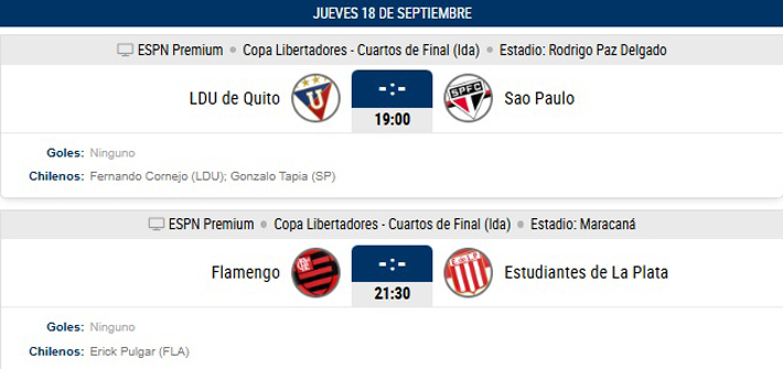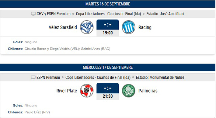En la Libertadores se disputarán los duelos de ida de los cuartos de final. Los cruces son: Vélez Sarsfield vs Racing, River Plate vs Palmeiras, Liga de Quito vs Sao Paulo y Estudiantes de La Plata vs Flamengo.