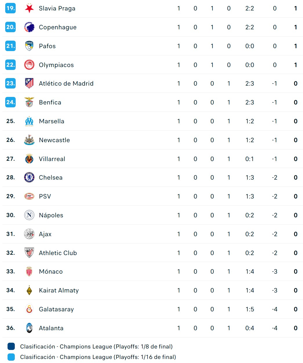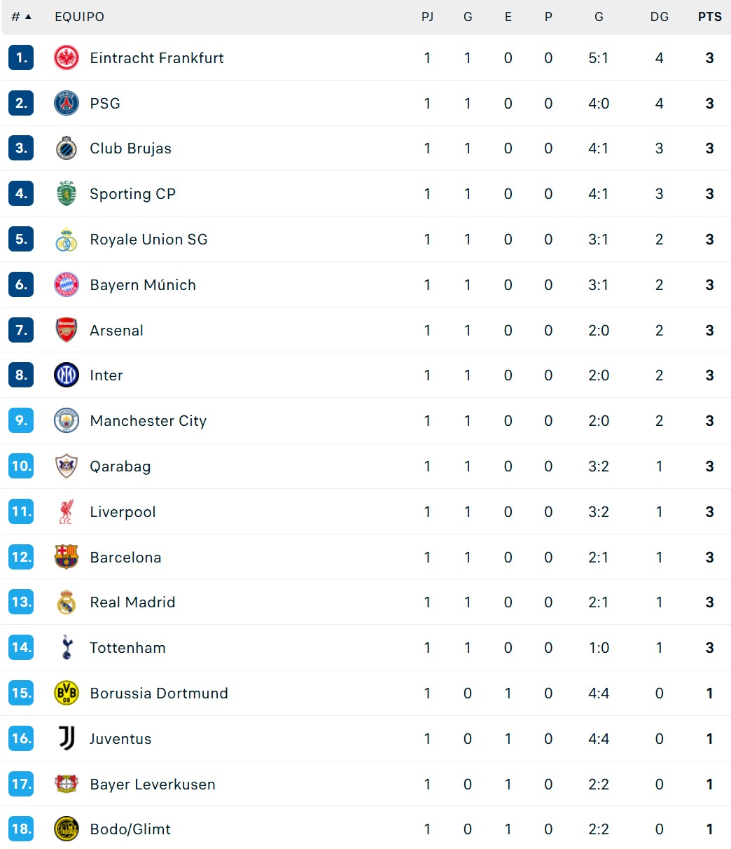 La tabla de la Champions League