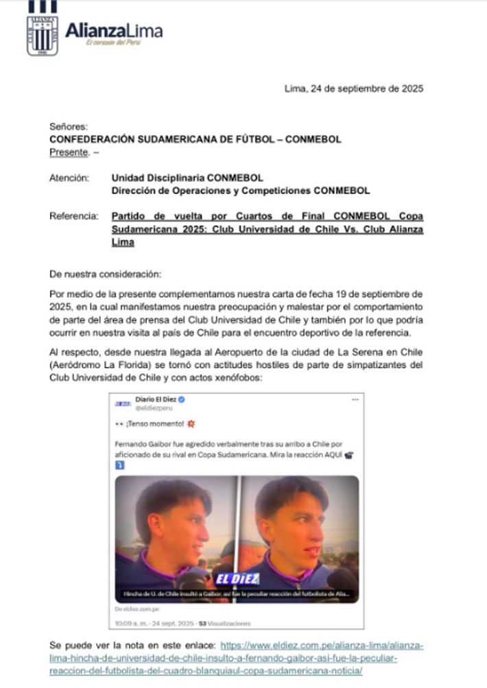 En el escrito el elenco visitante también informó agresiones a un hincha peruano. Incluso incluye un artículo de prensa para ratificar dicha acusación.