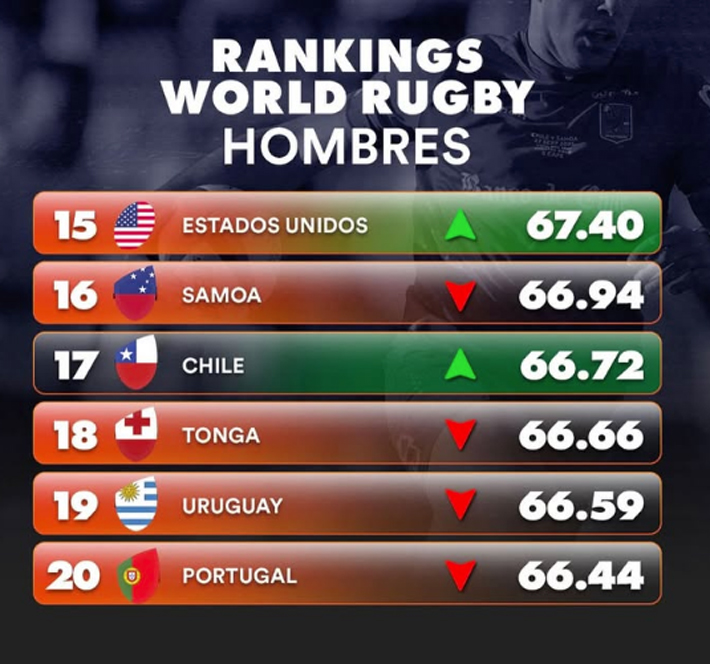 Y es que la selección chilena de rugby subió del 20° al 17°, alcanzando su mejor ubicación histórica y de paso, superando por primera vez a Uruguay, que está 19°.