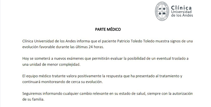 "Clínica Universidad de Los Andes informa que el paciente Patricio Toledo muestra signos de una evolución favorable durante las últimas 24 horas", informaron.