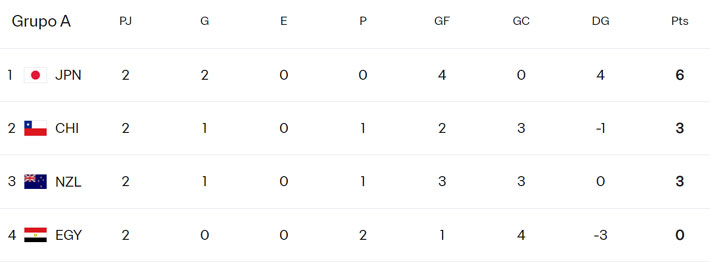 Japón lidera con 6 puntos y campaña perfecta. La selección nacional tiene 3, los mismos que Nueva Zelanda, que posee mejor diferencia de goles (0 contra -1). Sin embargo, la "Roja" aparece segunda. ¿Por qué?