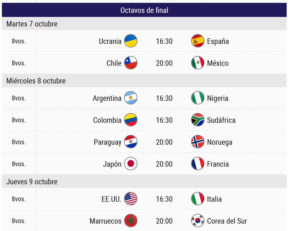 En tanto, por el sector bajo de las llaves destacan los encuentros Estados Unidos-Italia y Japón-Francia. El otro sudamericano Paraguay va con Noruega y la sorpresa Marruecos dirimirá su suerte con Corea del Sur.